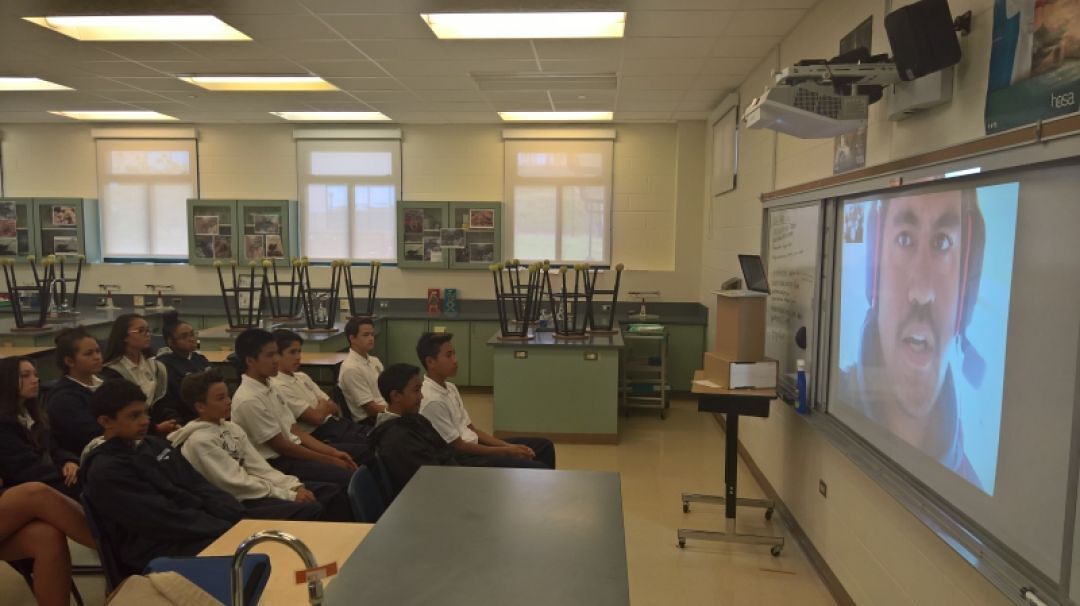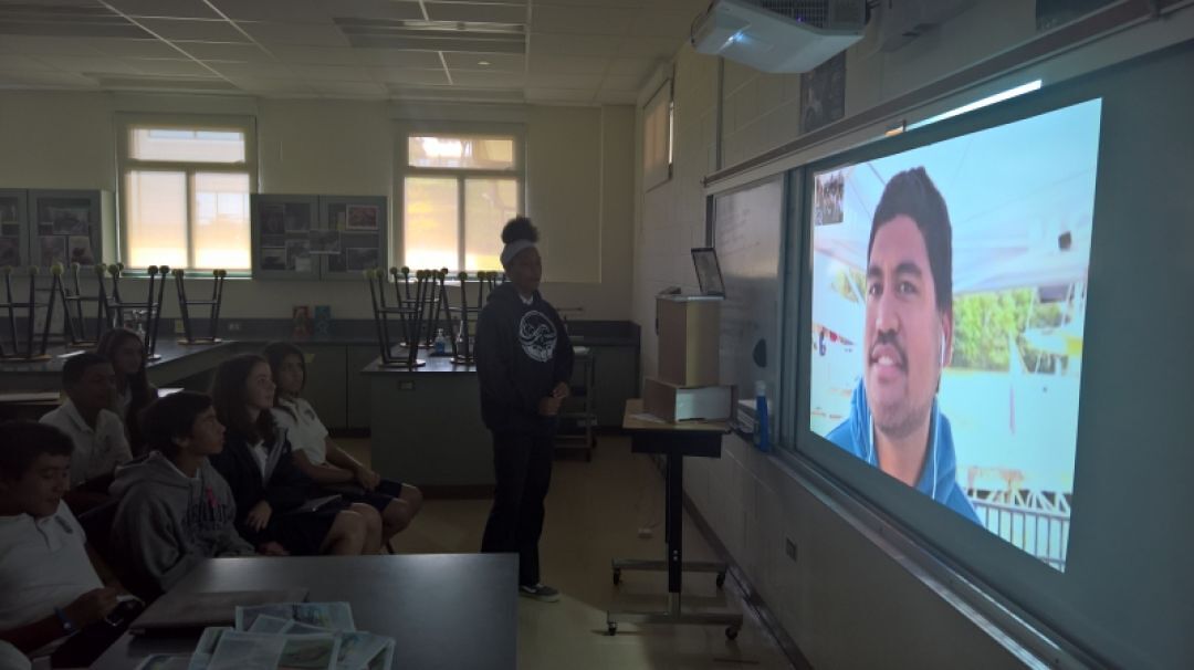 Haumāna in Kumu Brooke Holderbaum’s Biology class spoke with the crew on the Hōkūleʻa. While many of the haumāna’s questions were not biology-related, they were very excited to make a connection with the crew and listen to Maui-born crew member Nakua share his experiences on Hōkūleʻa. The timing of the talks fit well in this quarter – after students studied latitude, climate, weather, currents, and Hōkūleʻaʻs course; the day after a star compass presentation by guest lecturer Pā’anakalā Babayan Tanaka, educator and apprentice navigator with Hui o Waʻa Kaulua, Maui’s Voyaging Society.