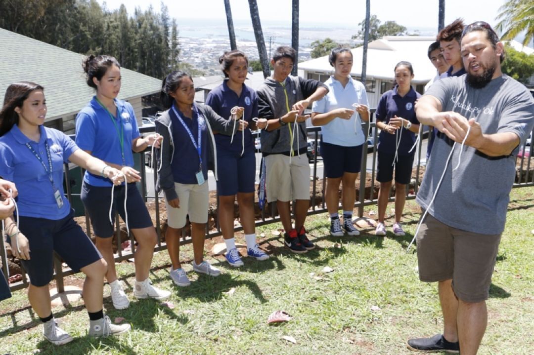 As the fish cooked, Cultural Specialist Lāiana Kanoa-Wong teaches students the first step in tying a correct hīpuʻu pōlena or bowline knot.
