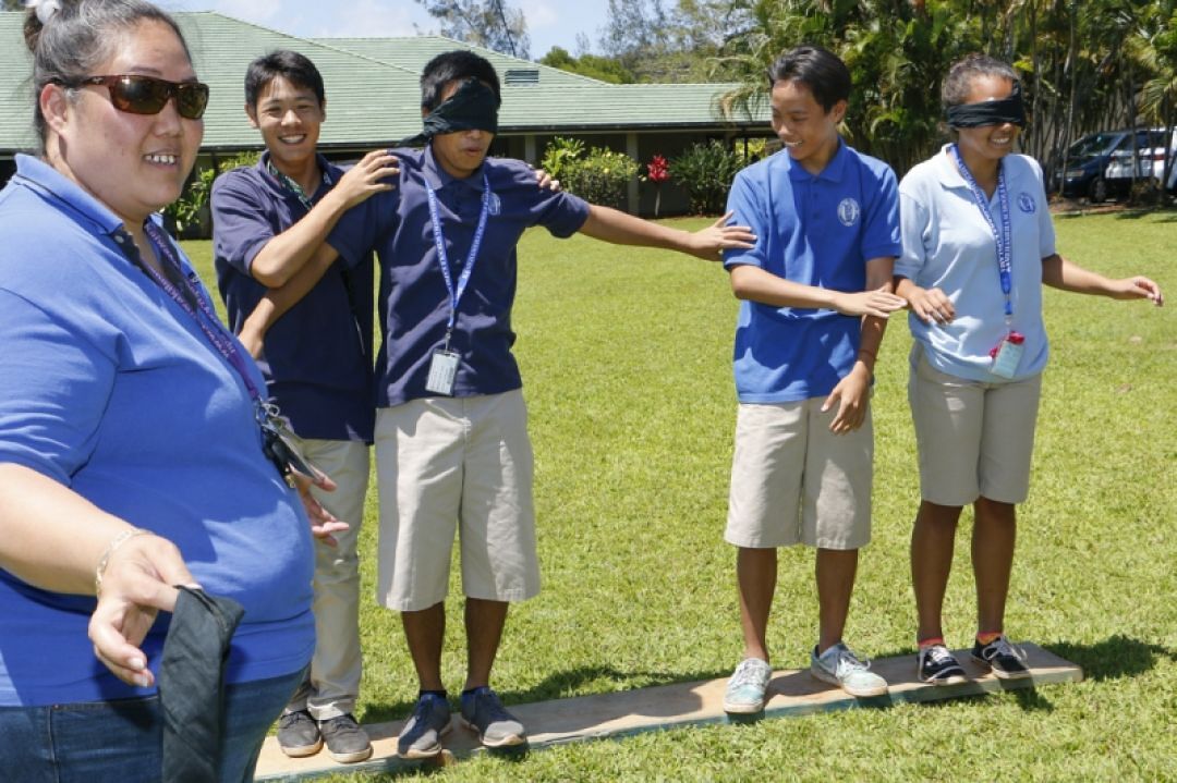 Cultural Resource Specialist Hōkū Akana explains the pāʻani Papa Kelepona (Telephone Board game) where students explore concepts of mālama honua (to care for the Island Earth) while exercising leadership skills to assist others who are blindfolded.