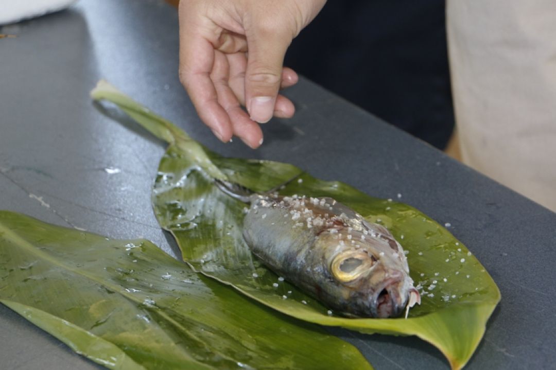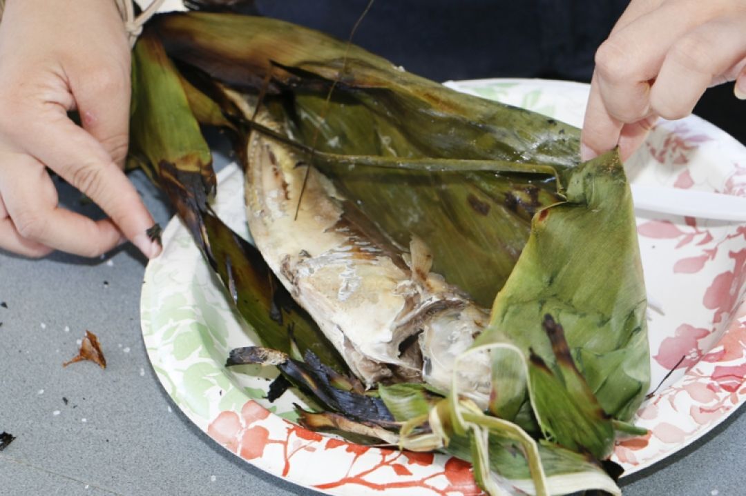 Prior to the grilling, students learn how to lūlū (sprinkle salt on the fish to season) and wrap the fish in tī leaves.