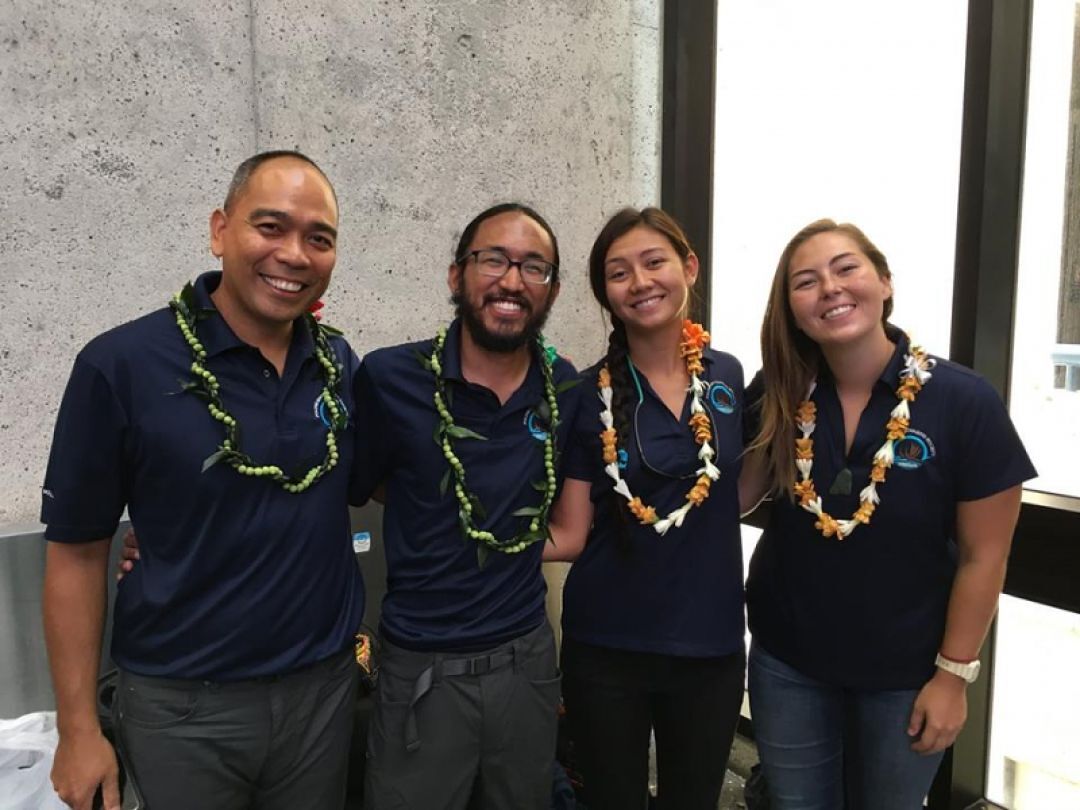 The Final Four crew members Manuel Mejia, Kī'aha, Jackie Meggs and Hana Yoshihata depart Honolulu to join the rest of the Leg 24 crew.