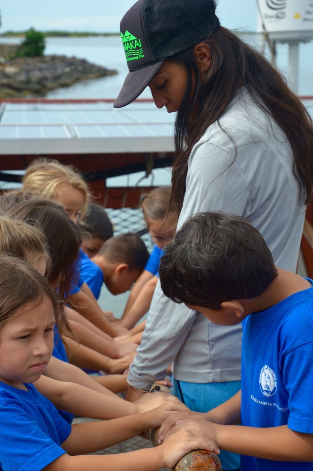 Polynesian Voyaging Society volunteer Kaʻaiʻōhelo McAfee-Torco gives keiki a chance to work the Hikianalia's hoe ʻuli (steering paddle).