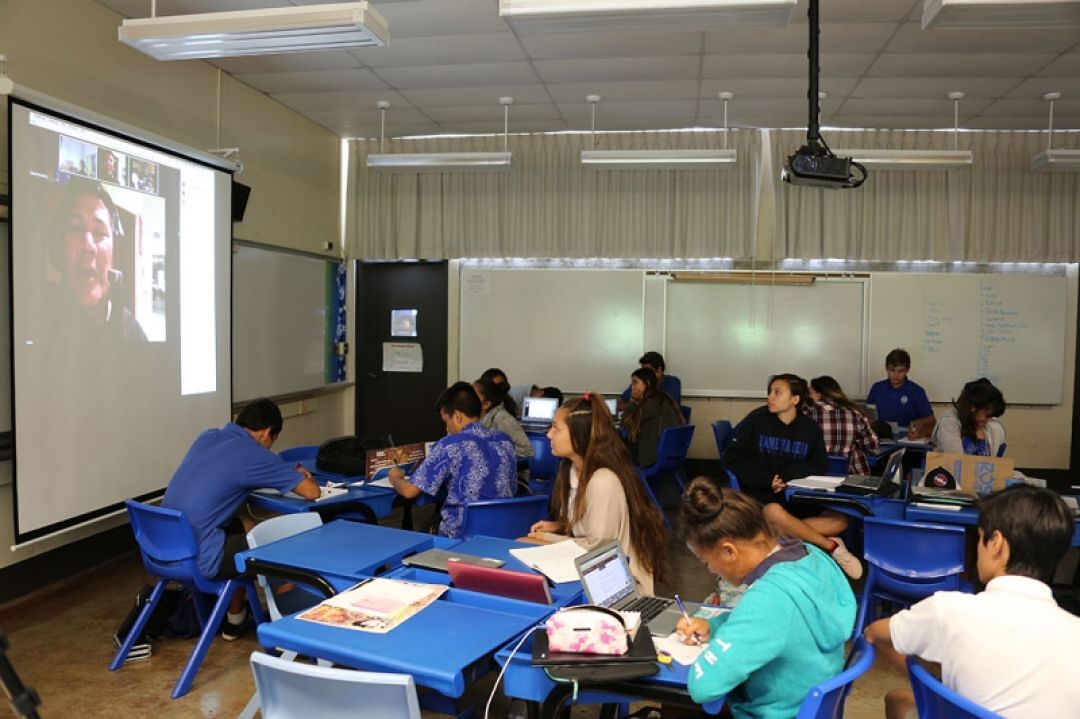 She has one of her four classes interact via a video calls with the waʻa and records the call for her other classes to watch later. All four classes work on generating questions that will be asked during the engagement.