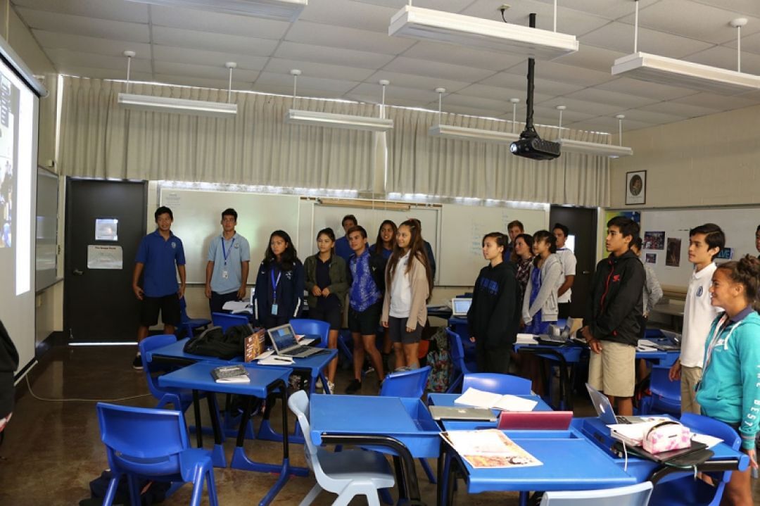 The traits question related back to a poster project students were working on, presenting traits they researched in historical figures. Between doing research on their own and being able to ask a Hawaiʻi group who has spent the past three years interacting with groups across the globe, they are able to hear how leadership and culture is perpetuated in other communities.