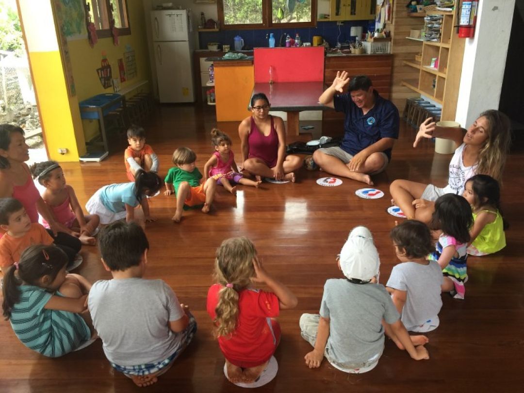 Hōkūleʻa crew members KS Executive Strategy Consultant Dr. Shawn Kanaʻiaupuni and Senior Program Manager Mark Ellis (center, seated) visit the keiki and kumu of Le Jardin del Mar Preschool in the Galápagos Islands.