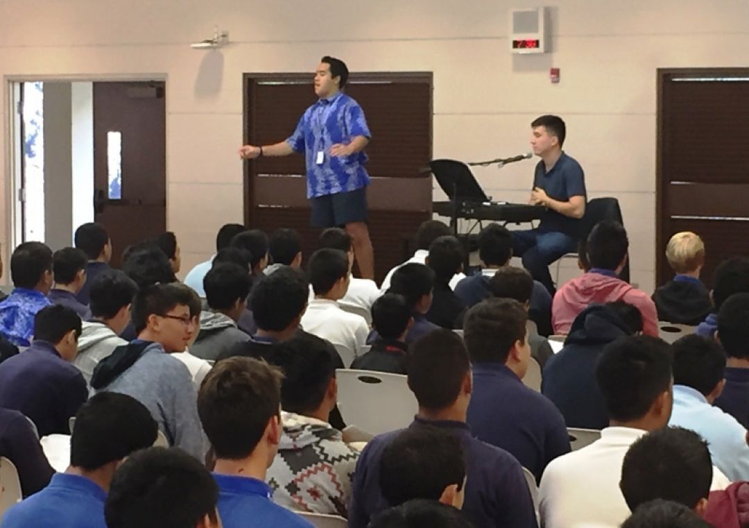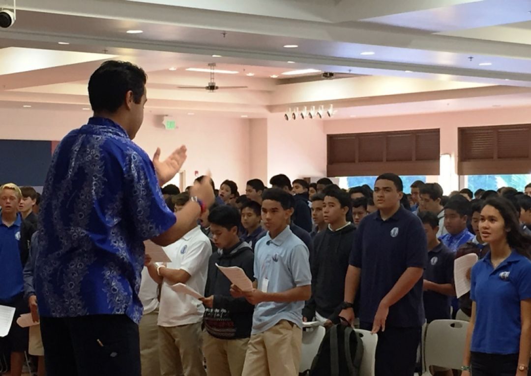 ʻElia Akaka leads his classmates in the mele, “Holo i ke Kai” arranged by Kaʻiwakīloumoku Facilities Coordinator and musician Bowe Souza (on piano.)