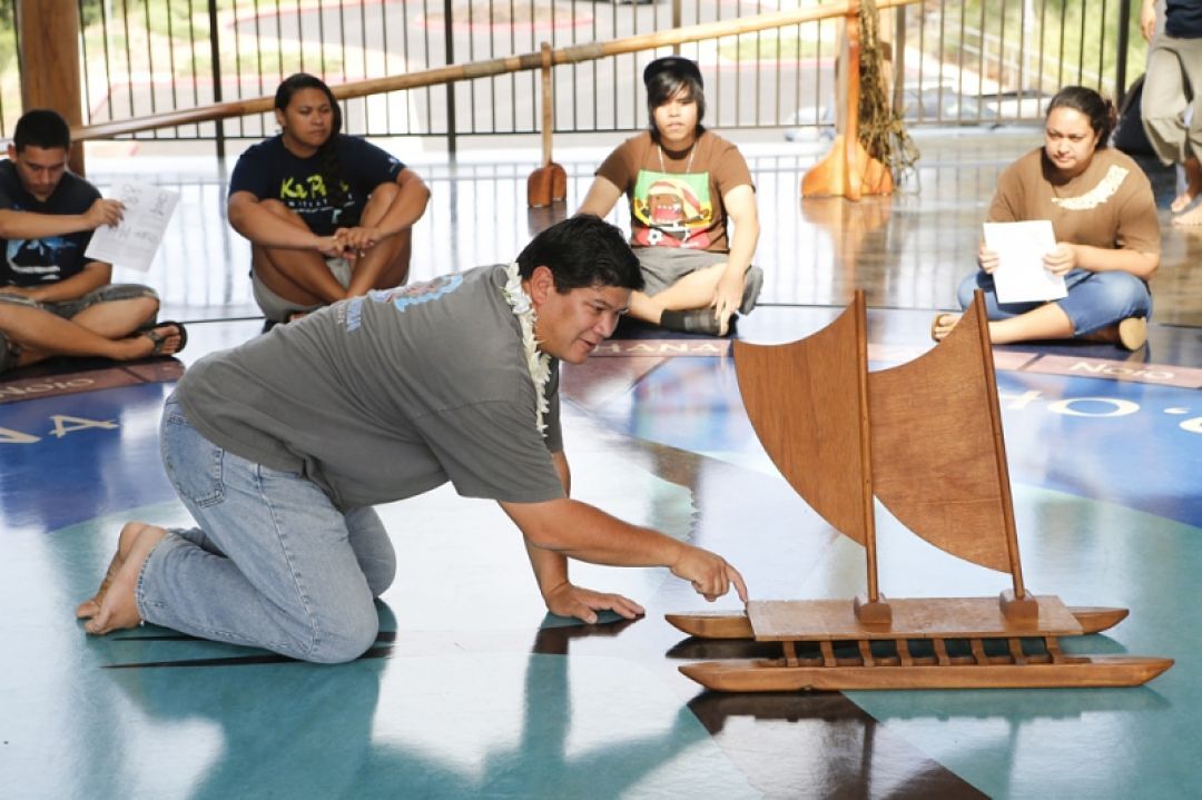 KS Cultural Specialist and Mark Ellis, teaches students about wayfaring and shares his experiences as a Hikianalia crew member for the Mālama Honua Worldwide Voyage as part of a day-long huakaʻi (field trip).