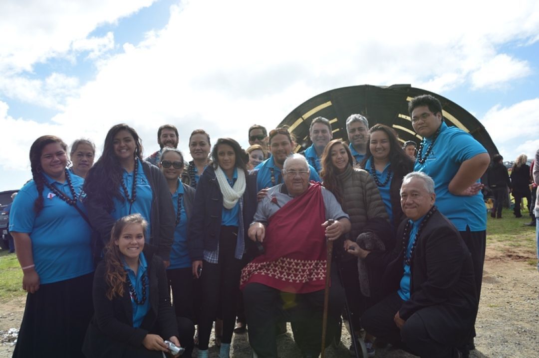 Revered Māori master carver and navigator Hekenukumai “Uncle Hector” Busby (center) and the delegation at Aurere in Mangonui, after the formal departure ceremony for Hōkūle‘a.