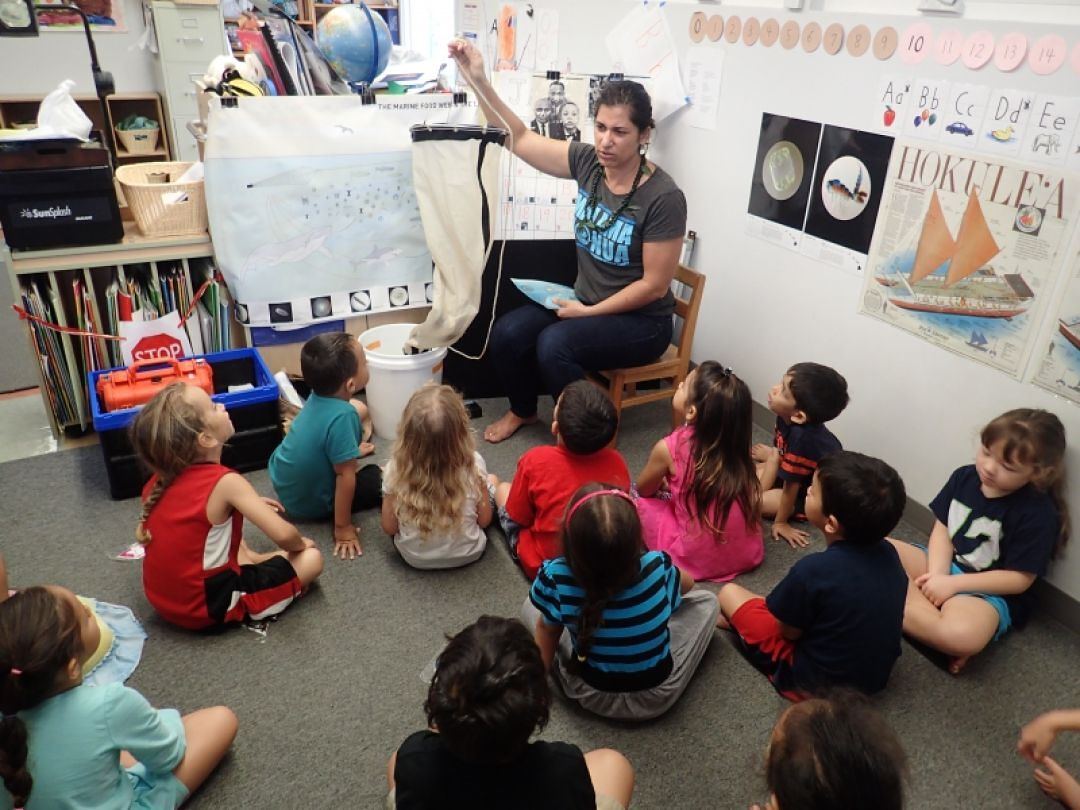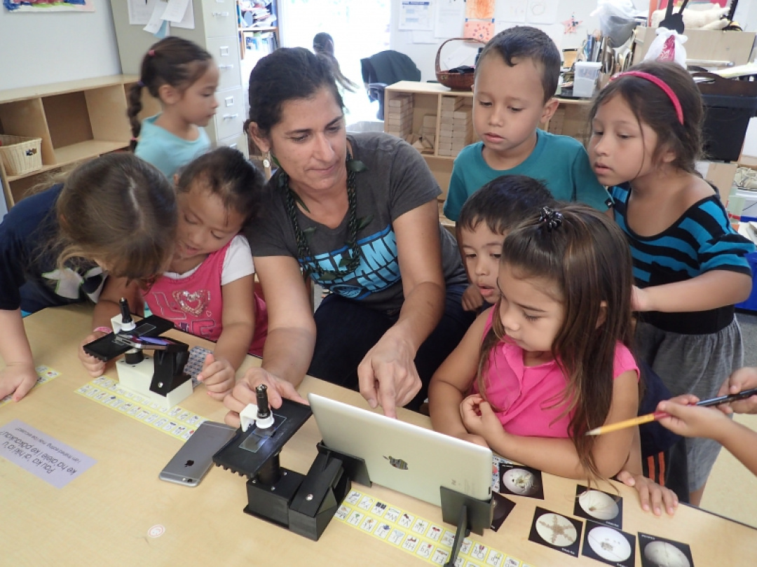 Hikianalia Polynesian voyaging canoe crew member Anuschka Faucci (Auntie Anu to keiki) teaches the children about plankton using a tool called a CellScope.