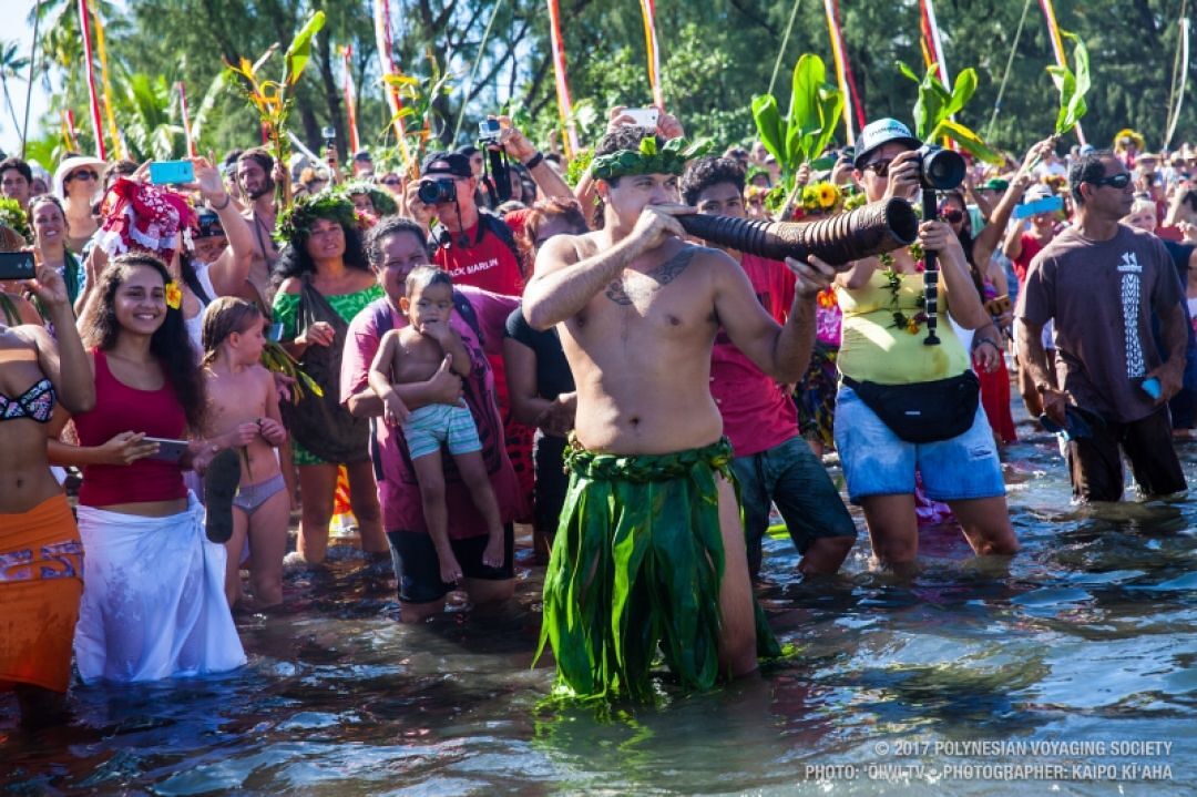Haumāna dance, performing their kuleana in representing Hawaiʻi, as Hōkūleʻa returns back to Taputapuatea for a voyaging ritual and ceremony.