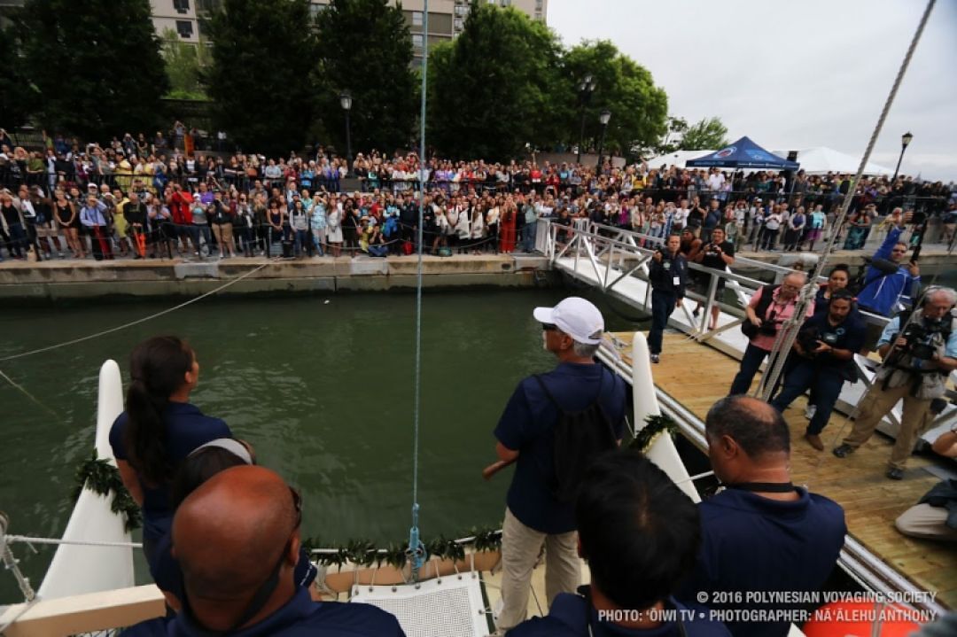 Thousands greet the voyaging canoe in a special ceremony at North Cove Marina.