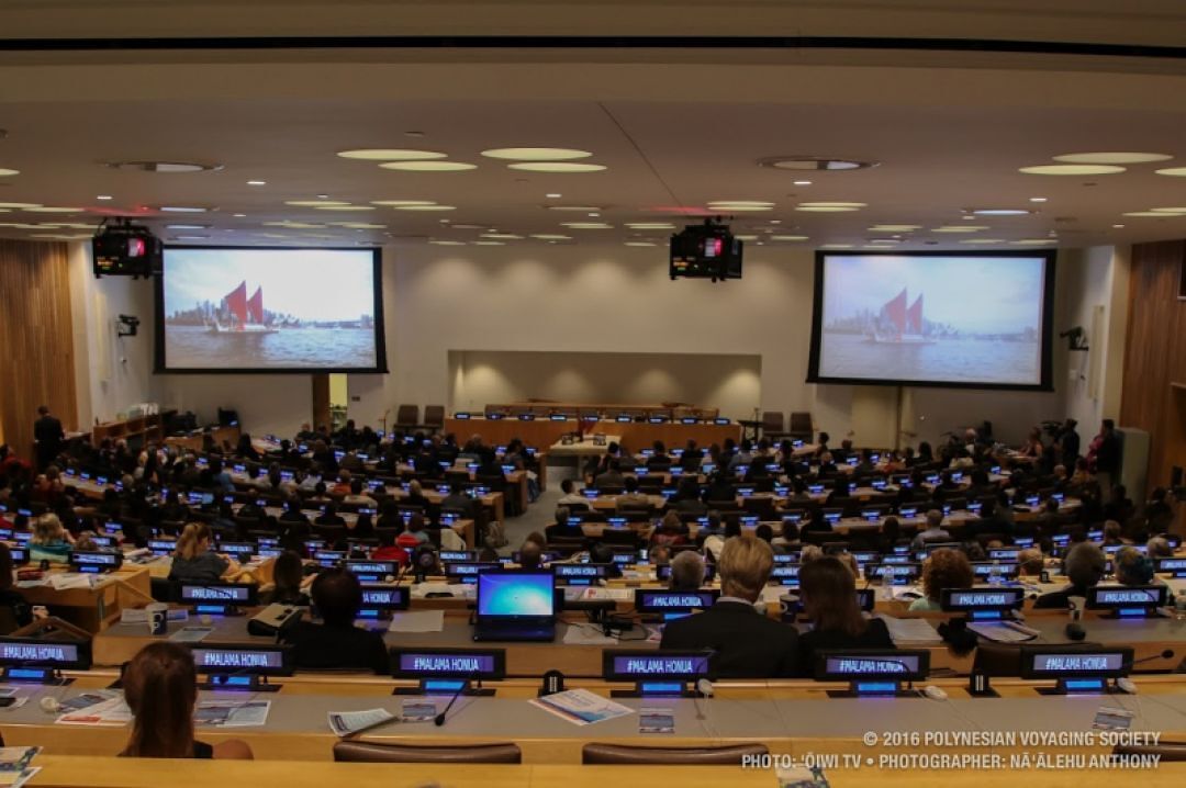 Video shared during the Hōkūleʻa Worldwide Voyage visit to participate in the United Nations' World Oceans Day on June 8, 2016, spreading their message of Mālama Honua.