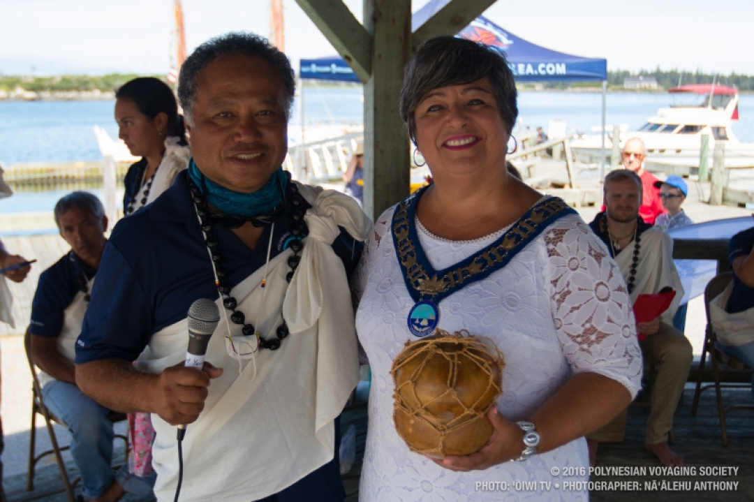 Captain Kālepa Baybayan presents an ipu on behalf of the voyage to the Mi’kmaq tribe and Yarmouth community.