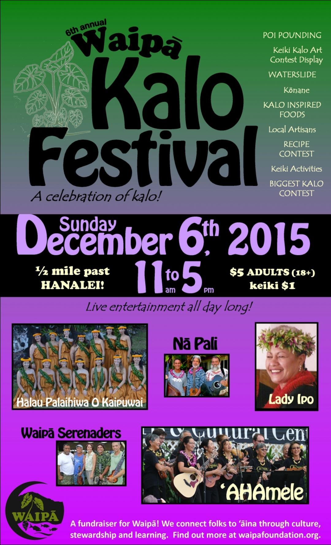 Attendees will also enjoy kalo-inspired food, local artisans, a recipe contest and live entertainment from Hālau Palaihiwa O Kaipuwai, Nā Pali, Lady Ipo, Waipā Serenaders and ʻAHAmele.