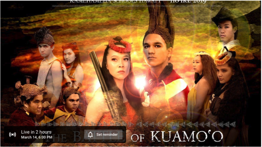 Watch the broadcast of the Thursday night performance of The Battle of kuamo'o, a Hawaiian opera that is the featured story for hō'ike 2019. A student team ran the broadcast on Lehua TV.