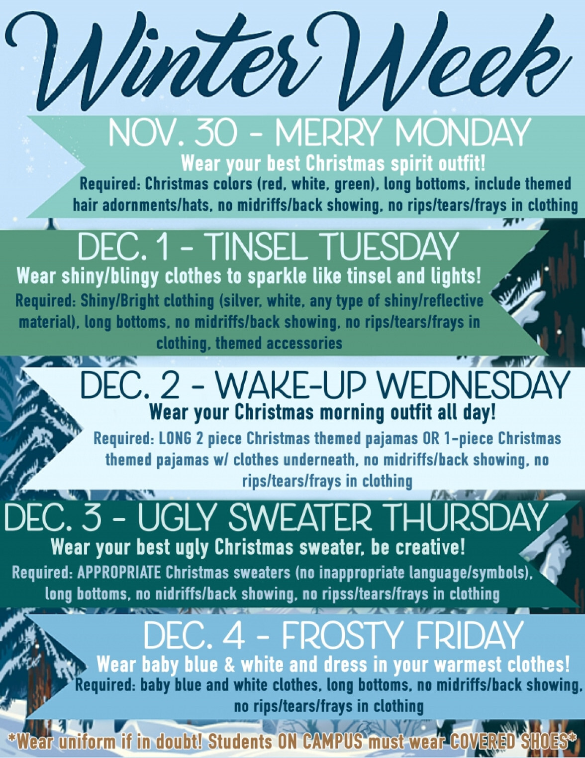Please remember to keep all dress up appropriate. Outfits should match all school guidelines. Students on-campus are reminded that their attire must meet regulations from head to toe and are asked to wear covered shoes. See the handbook for more specifics.