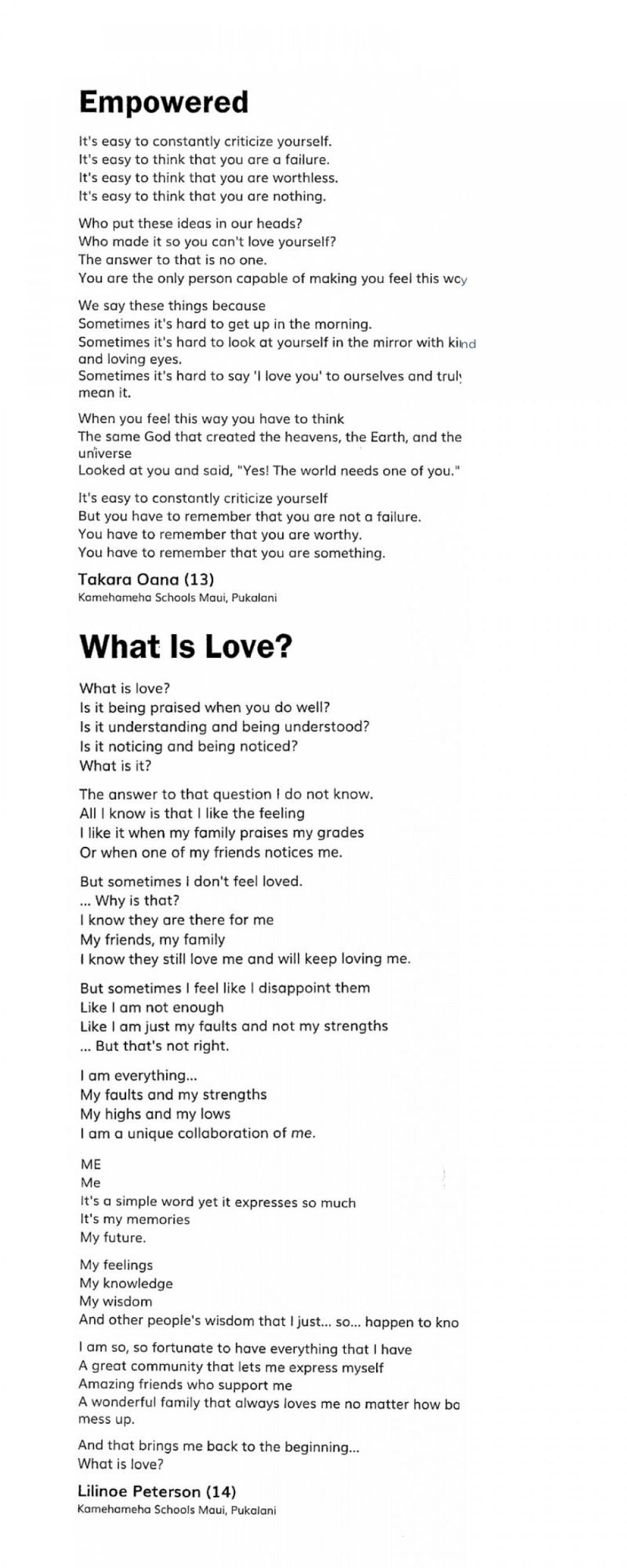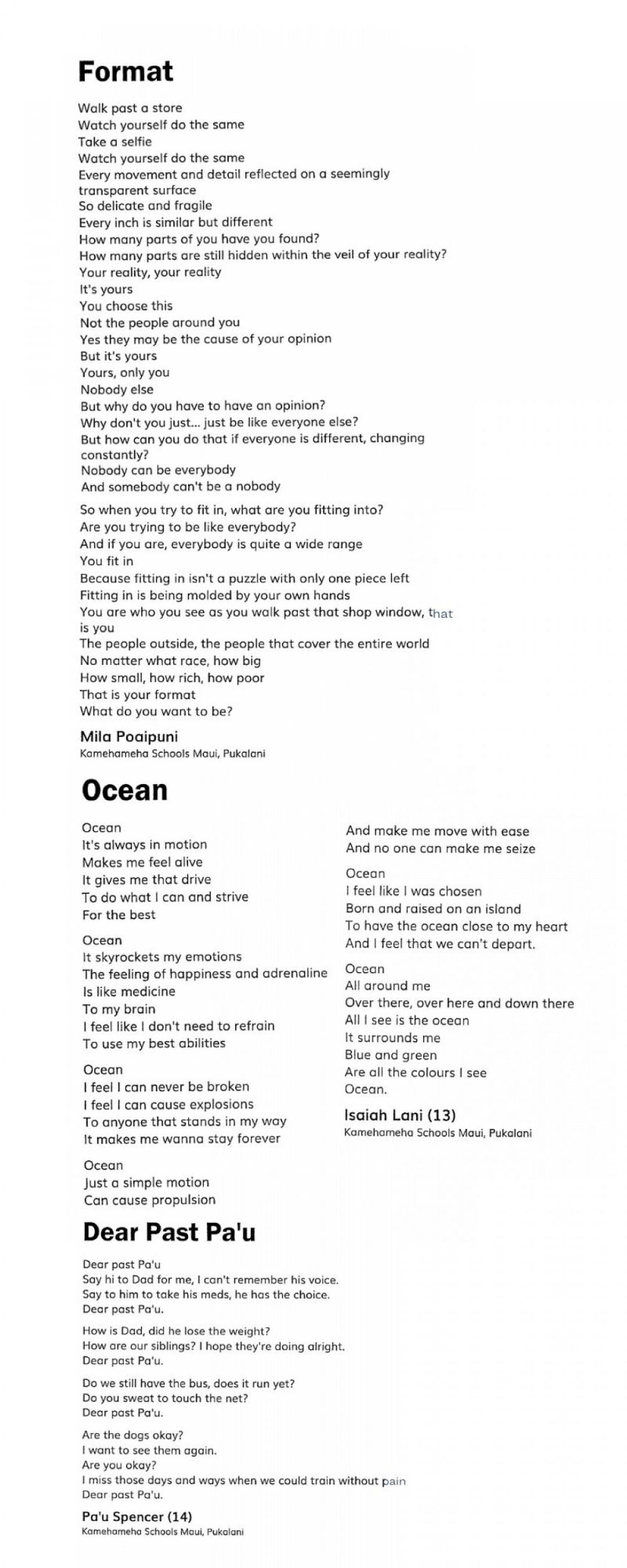Freshman Mila Poaipuni said her poem “Format,” which she wrote as an eighth-grader, was a way to express the challenges of living up to the expectations of her peers and the images on social media. She wrote, “Nobody can be everybody / And somebody can’t be a nobody / So when you try to fit in, what are you fitting into? / Are you trying to be like everybody? / And if you are, everybody is quite a wide range.”