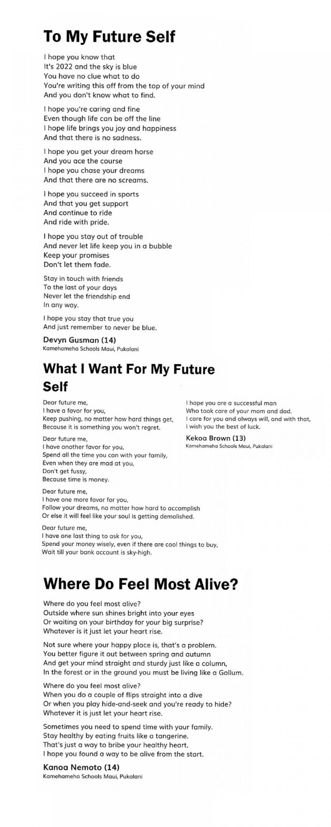 In freshman Kekoa Brown’s poem “What I Want for My Future Self,” which he wrote as an eighth-grader last year, he said, “Dear future me / I have a favor for you, / Keep pushing, no matter how hard things get, / Because it is something you won’t regret.”