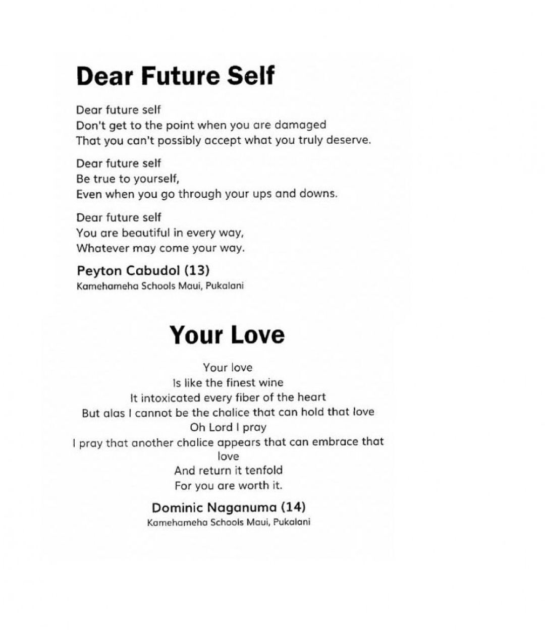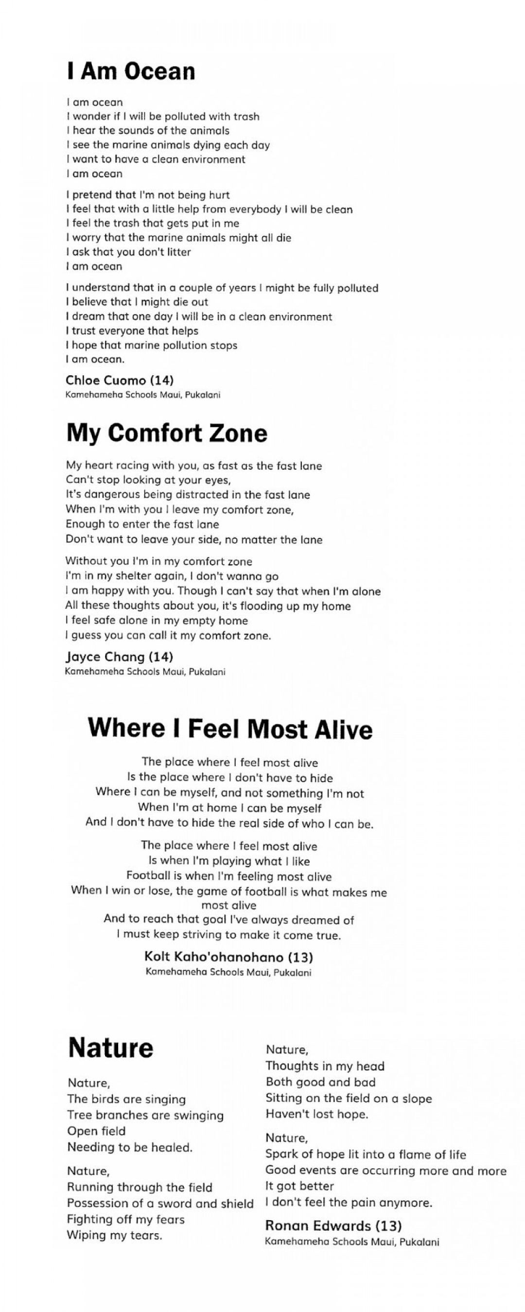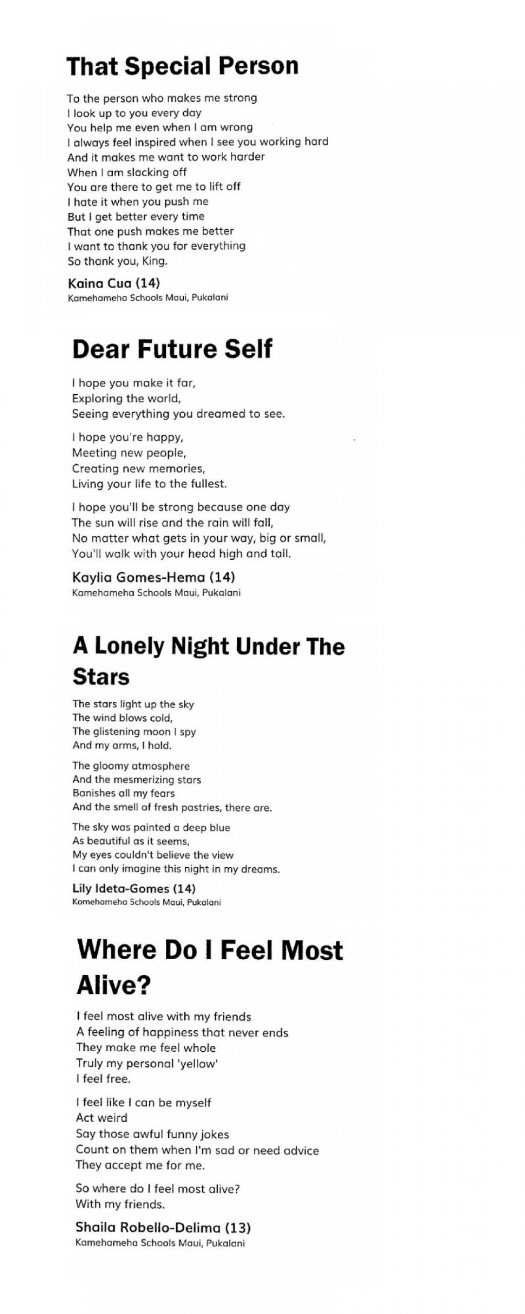 “I wasn’t initially prepared for the depth of thought and expression that they put into their poems,” said Robin Prais, eighth-grade English kumu at Māhele Luna. “The risks they took to reveal their inner thoughts and feelings really moved me.”