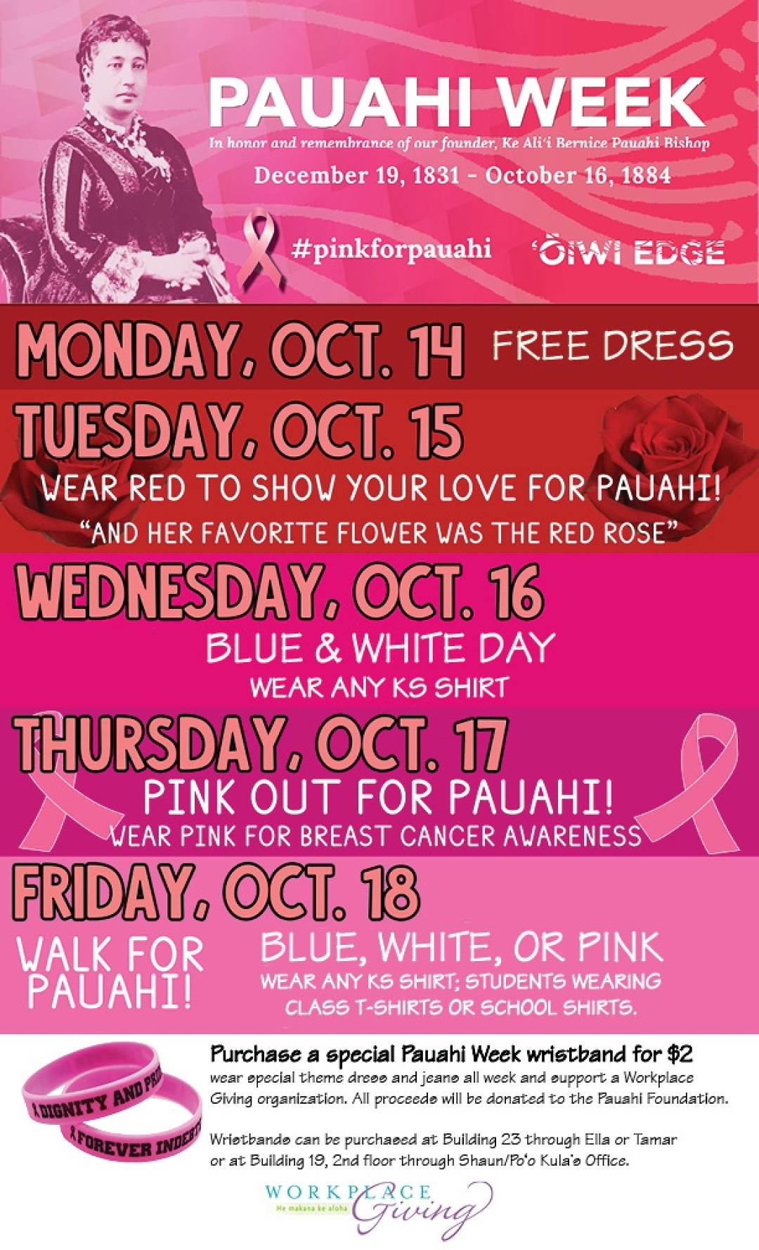 Pauahi Week themes for staff. Dress in theme colors with jeans with the purchase of a special $2 wristband.