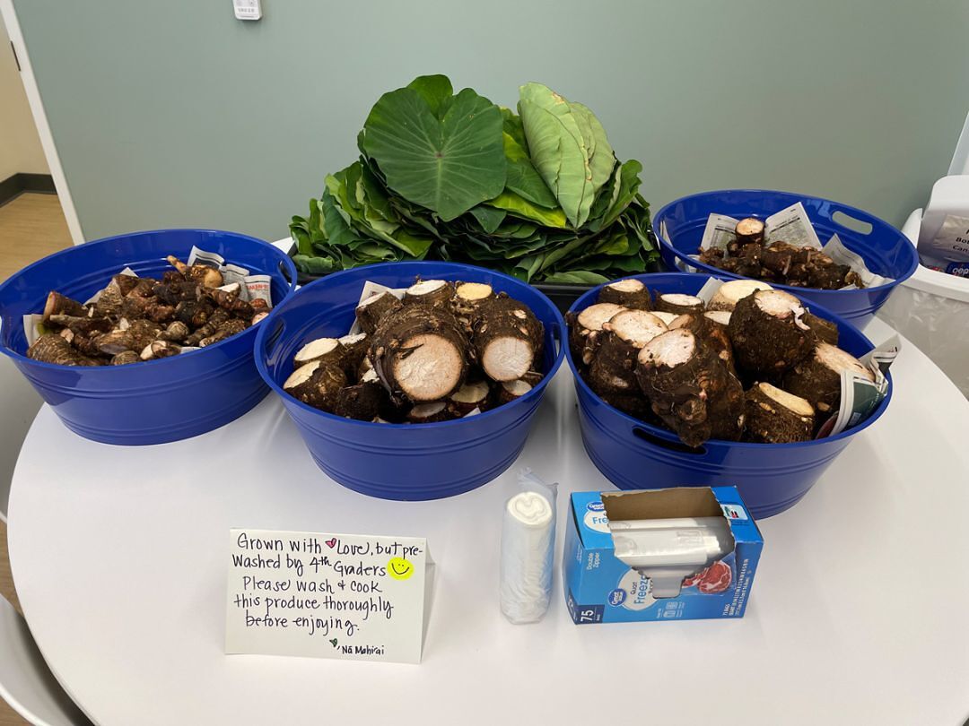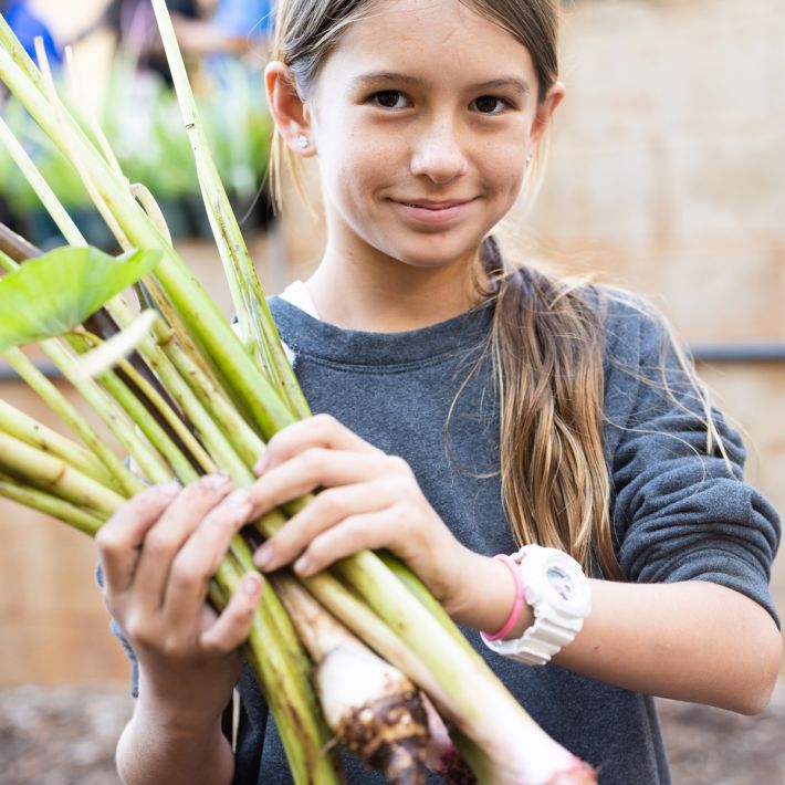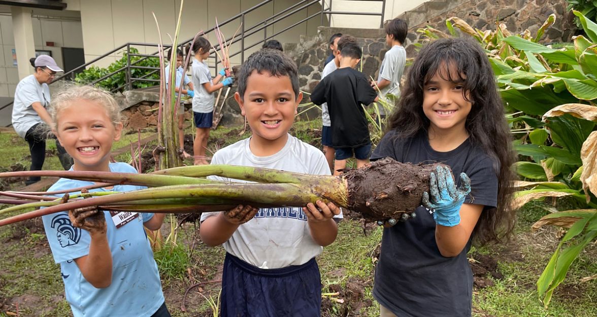 This hands-on problem-based learning approach supports the development of the E Ola! graduate. “Students have jobs to do, to show their servant leadership, to show that they can care for things, and they seem to really embrace all of the responsibility,” states Mishina. “Every grade level has some type of kuleana in the dining hall and in the garden. Learning to grow food is an important skill for anyone, but being able to grow our traditional foods using ‘ike kūpuna takes learning to another level. Understanding our traditional food systems and how important they are to preserve promotes aloha ‘āina and reciprocity- the idea that preserving culture and preserving these plants go hand in hand.”