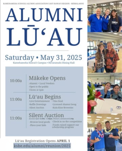 Kamehameha Schools Alumni from all three campuses are invited to join together at the Hawaiʻi campus on Saturday, May 31 for the annual alumni lūʻau.