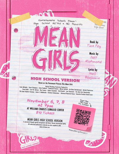 The 2025 Fall Musical is MEAN GIRLS High School Version. It's based on the smash Broadway hit, based on the 2004 hit film from Tina Fey, staring Lindsey Lohan and Rachel McAdams. Three public shows - November 6, 7, and 8.