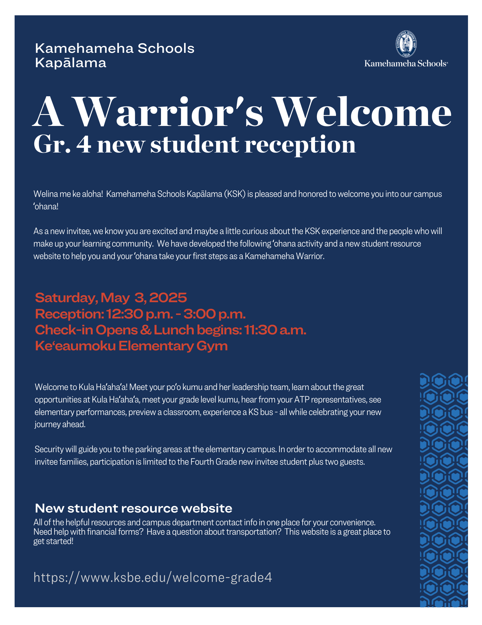 The Nā Pua Lei a Pauahi Summer Program session is highly recommended for all grade 4 new invitee haumāna. Session dates are June 9 through July 12. There is no cost for this course as it is designed to assist with new school transition. Details will be sent upon acceptance.