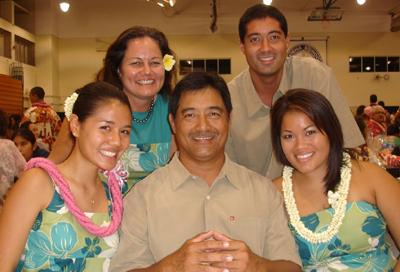 The Cummings family celebrates an evening of food, fellowship and fun at Kamehameha's Senior Luau. Front row: Ciera Cummings, father Abe, and sister Kawai. Back row: mother Carol and brother Michael.
