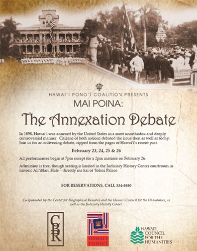 The vivid re-enactment of the discussions and actions that eventually resulted in Hawai'i becoming a territory of the United States is presented by the Hawai'i Pono'ī Coalition and the Biographical Research Center, and co-sponsored by the Kamehameha V Judiciary History Center, with funding from the Hawai'i Council for the Humanities. Admission is free; reservations are strongly recommended.