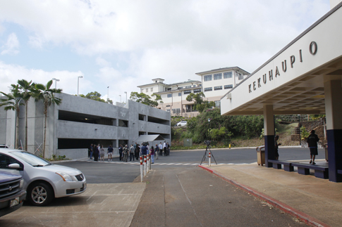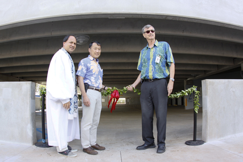 Hale Ho'oku Ka'a, the parking structure next to Kekuhaupi'o Gymnasium, had its official blessing and opening ceremony Monday with Po'o Kula Earl Kim and Facilities Manager Robert Ramsey untying the maile. Kahu Kordell Kekoa presided over the blessing.