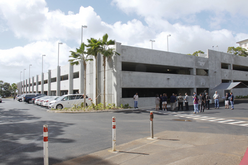 The structure has seven total levels in a bi-level design with 477 stalls in the structure and another 32 along the side, adding more than 500 parking spaces for the campus. There are two vehicle entry points for the structure, one on Bishop Drive that goes to the fifth level and another on the roadway to the gymnasium, which goes to the second level. There are stairwells on both ends, with an elevator on the makai end that goes up to a new walkway that gives direct access from Hale Ho'oku Ka'a to Kūnuiākea Stadium, over Bishop Drive.
