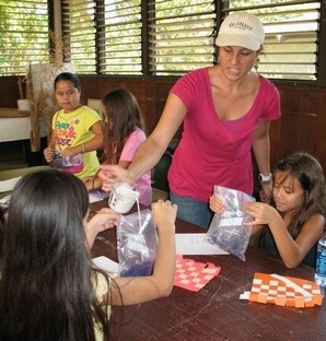 Kamehameha Schools Literacy Support Specialist Kaleialoha Medeiros helped third graders from He'eia Elementary make their own ko'elepalau, a snack with sweet potato and coconut milk. (Photo: Kamehameha Schools)