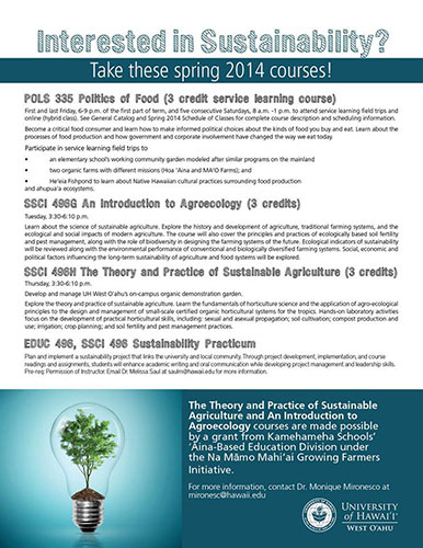 Along with a Politics of Food course and Sustainability Practicum, these new courses will be offered in the Spring 2014 semester for students interested in sustainability. For more information, contact Dr. Monique Mironesco at mironesc@hawaii.edu or visit http://www.uhwo.hawaii.edu/.