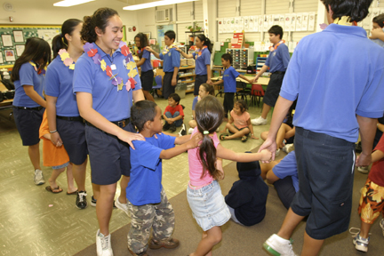 "The kids are so friendly on both sides," said Kamalu Poepoe, Hawaiian immersion curriculum coordinator at Kualapu'u Elementary School. "It has a great impact on us as teachers. We see the students come in and offer fresh lessons, and we step outside of the box for a little while. There's a strong feeling of 'ohana."