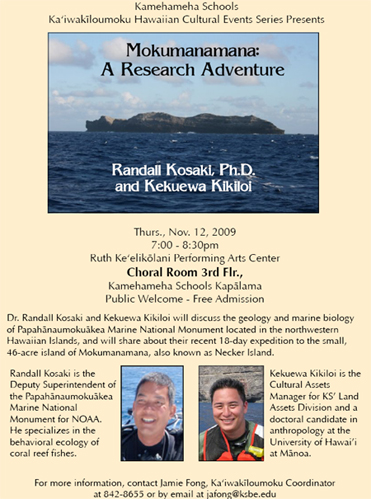 Dr. Randall Kosaki and Kekuewa Kikiloi will discuss the geology and marine biology of Papāhanaumokuakea Marine National Monument located in the northwestern Hawaiian Islands and will share about their recent 18-day expedition to the small, 46-acre island of Mokumanamana, also known as Necker Island.