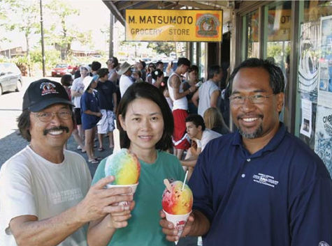 Stan and Noriko Matsumoto, owners of Matsumoto Shave Ice, and Kamehameha Schools asset manager Kalani Fronda '88 raise a shave ice toast to the completion of Kamehameha's North Shore Plan. In September, the Hawai'i Chapter of the American Planning Association honored Kamehameha's efforts with its 2008 Outstanding Planning Award. (Michael Young photo)