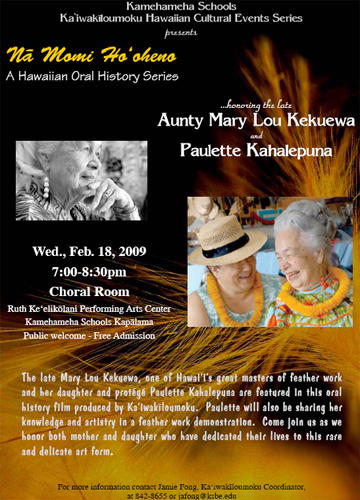 The late Mary Lou Kekuewa, one of Hawai'i's great masters of feather work and her daughter and protégé Paulette Kahalepuna are featured in this oral history film produced by Ka'iwakīloumoku. Paulette will also be sharing her knowledge and artistry in a feather work demonstration.