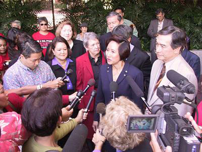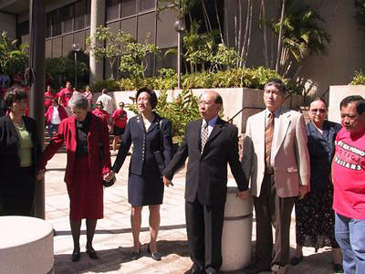 Kamehameha Schools supporters celebrated Judge Kay's ruling with KS trustees by chanting and singing the school song. Along with his fellow trustees, Admiral Robert Kihune thanked those gathered at court for their unwavering and dedicated support. "I can imagine our beloved Pauahi smiling down on all of us today."
