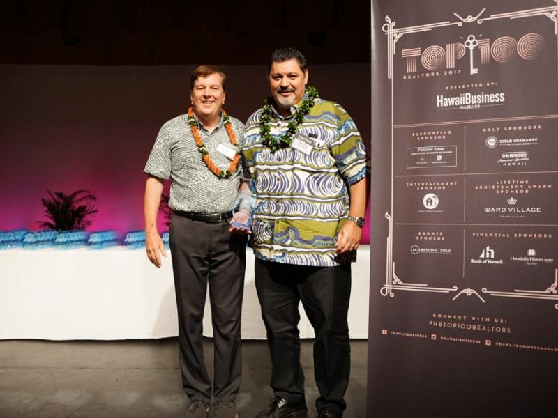 Steve Petranik from Hawaii Business Magazine presents KS representative Walter Thoemmes the Developer of the Year Award at the Top 100 Realtors Gala.
