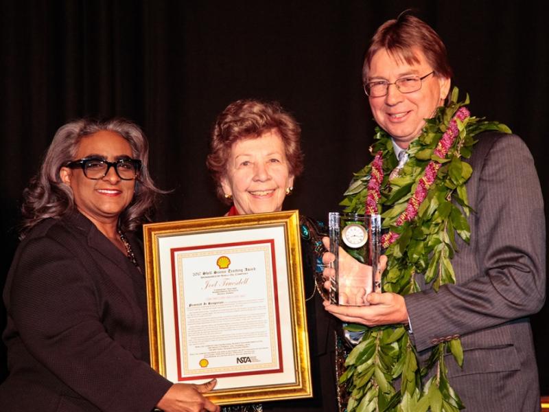 Karen Labat (Social Investment Manager at Shell Oil Company) and Mary Gronko (NSTA President) present Joel Truesdell with the 2017 Shell Science Teaching Award at the NSTA Teacher Awards Gala on Mar. 31.