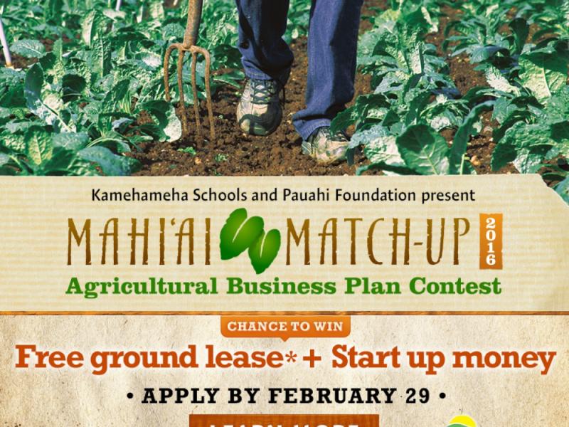 Kamehameha Schools and the Pauahi Foundation announce the return of Mahi‘ai Match-Up – an agricultural business plan contest dedicated to supporting Hawai‘i’s sustainable food movement and decreasing the state’s dependence on imports. All farmers, ranchers, entrepreneurs, or aspiring farmers with fresh, innovative ideas are welcome to enter. The application window opens today and ends Feb. 29, 2016.