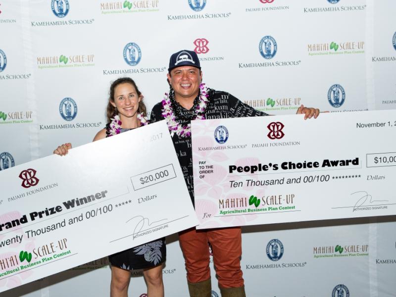 Dana Shapiro of Māla Kalu‘ulu, left, and Brandon Lee of Kaunamano Farm represent the winners of the 2017 Mahi‘ai Scale-up competition. Both farms are located on Hawai‘i island.