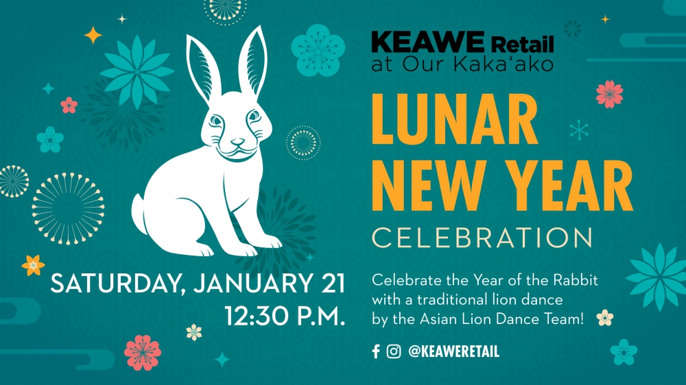 Ring in the Year of the Rabbit at Keawe Retail at Our Kaka‘ako on Saturday, January 21, 2023, at 12:30 p.m. Lunar New Year festivities will include a traditional Chinese Lion dance by the Asian Lion Dance Team. This family-friendly event is open to the public and free to attend.