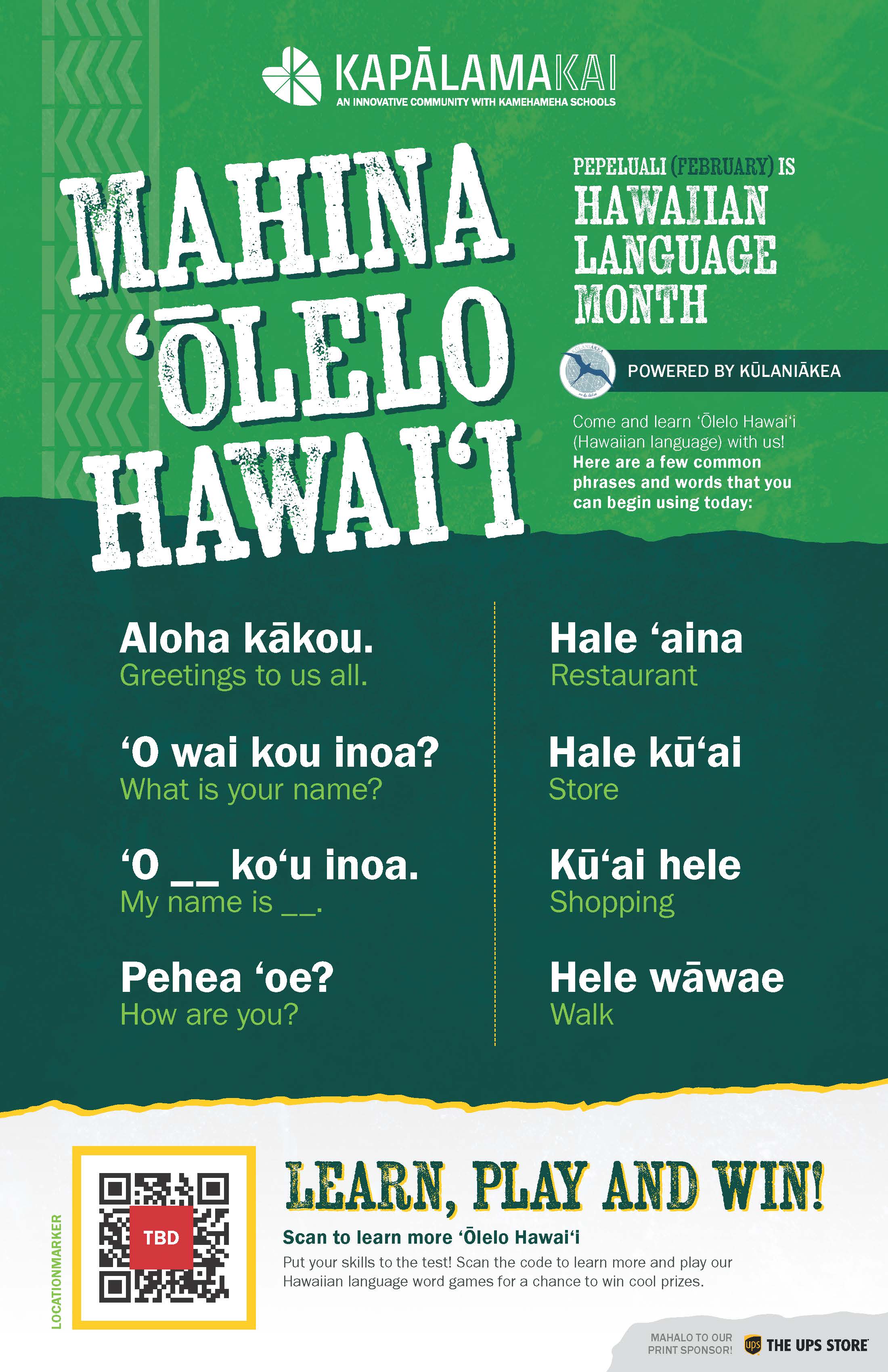 - Offering ‘Ōlelo Hawai‘i resources, games and giveaways at the Kapālama Kai booth during the Taste of Kalihi Market on Sat., Feb. 10, from 10 a.m. to 2 p.m. at Dillingham Plaza, in the parking lot adjacent to Burger King.