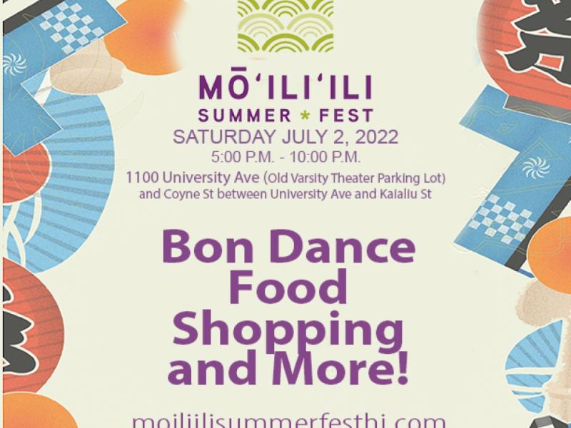 “The Mōʻiliʻili Hongwanji Mission has been holding Bon Dances in Mō,'iliʻili for over 100 years,” said Mōʻiliʻili Hongwanji Mission President, Joanne Kealoha “We’re very excited to bring this event back in collaboration with our community partners. Prior to the pandemic, the Summer Fest was a very well attended festival that really highlighted the cultural diversity, history, and businesses of Mōʻiliʻili.” Coyne Street between University Avenue and Kaialiu Street will be closed for the event and feature food vendors and comfort areas. Food vendors and retailers who are interested in participating may visit moiliilisummerfesthi.com.