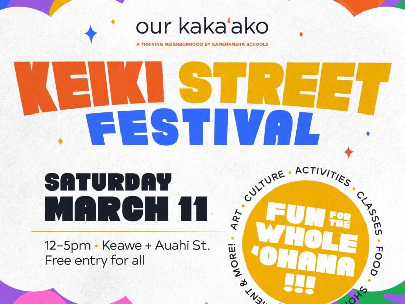 The Keiki Street Festival is a free, family-friendly community event sponsored in part by Kamehameha Schools, the Kaiāulu ‘o Kaka‘ako Owners Association, Hawaiian Electric Company and Waiākea Hawaiian Volcanic Water.