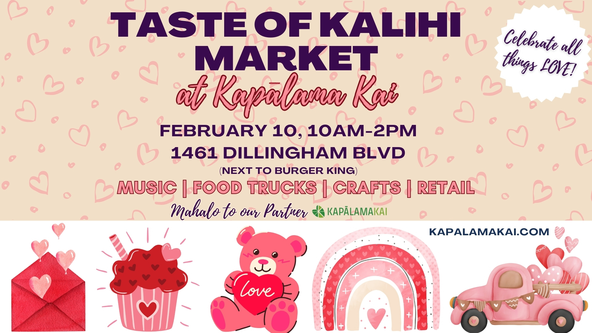 “As a Kalihi-born and raised entrepreneur and small business owner, I wanted to create a venue for our community to show their love to local businesses,” said Meghan Ofagalilo, founder of the Taste of Kalihi Market and owner of @madeby_megz, a dessert company known for their kalo (taro) crunch. “We’re excited to return to the Taste of Kalihi Market just in time for Valentine’s Day.”