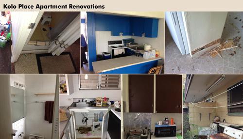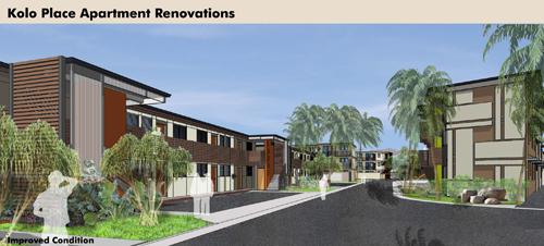 Between 2010 and 2012, Kamehameha Schools completed renovations of three similar buildings in the immediate vicinity: Rainbow Vista, Kolo Place phase I, and Malu Lani – formerly known as Kirin Apartments. Additional Kolo Place improvements will increase the total number of fully refurbished rental units in the university community to 142.