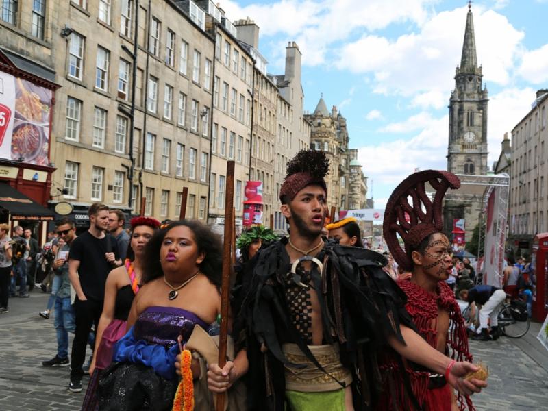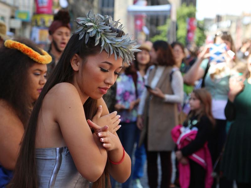 KS Hawaiʻi students took to the Fringe's Royal Mile hub to share their culture and promote their show.